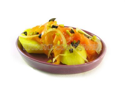 Las ensaladas son platos que permiten que prácticamente cualquier alimento forme parte de ellas. En este caso se utilizan alimentos tan variados como el salmón ahumado, las patatas, las cebolletas y las aceitunas. El salmón es el ingrediente que aporta a la ensalada proteínas de buena calidad y grasas insaturadas, que contribuyen a reducir los niveles de colesterol en sangre. Las patatas son fuente de hidratos de carbono, mientras que las cebolletas aportan a la ensalada diferentes vitaminas, minerales y sustancias antioxidantes. Además al acompañar la ensalada con aceitunas y aliñarla con aceite de oliva, se consigue que ésta se enriquezca en cuanto a su contenido en grasas insaturadas. Las características de todos estos componentes que forman parte de la ensalada, contribuyen a que ésta sea bastante completa desde el punto de vista nutricional.