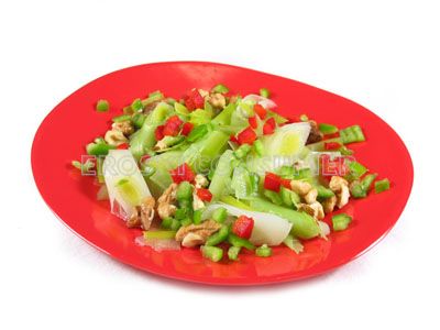 Esta receta presenta una ensalada que no está elaborada con ingredientes típicos como la lechuga o la escarola. En este caso el ingrediente principal son los puerros, que van a dar al plato un toque de originalidad tanto en su aspecto como en su sabor y textura, además de aportar buena cantidad de vitaminas, minerales, fibra y sustancias con acción antioxidante. Los puerros se acompañan de pimiento verde, buena fuente también de vitaminas y minerales, y de nueces. Los frutos secos son alimentos perfectos para añadir a una ensalada ya que además de dar color, aportan un contraste de sabores y textura realmente agradable. Los frutos secos además son buena fuente de grasas insaturadas, las llamadas "grasas buenas", que contribuyen a disminuir los niveles de colesterol en sangre. Además, su contenido en hidratos de carbono es relativamente bajo.