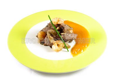La carne de ternera es una de las más consumidas, gracias principalmente a su suave textura y al agradable sabor de su carne. Esta carne es considerada buena fuente de proteínas de alto valor biológico y no posee niveles elevados de grasa. Además la grasa de este tipo de carnes es muy fácil de eliminar ante de ser cocinada, por lo que se consigue que este contenido graso sea aun menor. En este caso la carne de ternera se acompaña de una guarnición elaborada a base de setas y gambas. Las setas poseen un bajo contenido graso, mientras que presentan buenas cantidades de diferentes vitaminas y minerales. Las gambas tampoco van a contribuir a aumentar el contenido calórico del plato, si bien son buena fuente de proteínas de alta calidad. Tanto las setas como las gambas además de dar un toque muy original a la presentación del plato, van a conseguir un contraste de sabores muy agradables junto al excelente sabor de la ternera.
