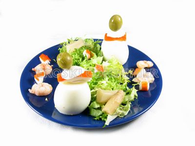 Los huevos rellenos son un plato muy popular, gracias a su agradable sabor y a la facilidad y rapidez con que se elabora. En este caso los huevos, fuente de proteínas de buena calidad, se rellenan con palitos de cangrejo y atún. Ambos alimentos son también buena fuente de proteínas. El relleno se completa con una salsa mayonesa, que además de dar sabor, hace que los ingredientes del relleno se liguen. La salsa mayonesa, debido a los ingredientes utilizados en su elaboración, es una salsa de alto contenido graso, por lo que si se desea disminuir el contenido calórico del plato, resulta útil sustituir esta salsa por una variedad baja en calorías, o bien reemplazarla por otro tipo de salsa más ligera, elaborada por ejemplo a base de vegetales. Al acompañar los huevos con una guarnición de lechuga se aumenta el contenido en vitaminas y antioxidantes, además de hacer que la presencia del plato resulte mas atractiva.