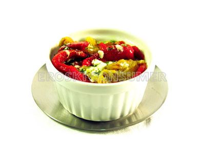 Vertemos la salsa sobre los pimientos y las cebollas, mezclamos todo muy bien, adornamos con las aceitunas negras y espolvoreamos con el perejil muy picado.