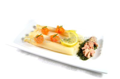 Los espárragos son alimentos con un elevado contenido en agua, lo que hace que su valor calórico y de hidratos de carbono sea muy bajo. Además son fuente de diferentes vitaminas, minerales, fibra y antioxidantes. Los espárragos se acompañan con atún, que aporta proteínas de alto valor biológico y diferentes minerales. Para acompañar este plato se elabora una salsa de zanahoria. En ella se emplea zanahoria, rica en vitaminas, minerales y antioxidantes; y patata, fuente de hidratos de carbono complejos. Este tipo de platos poseen una presencia y sabor muy agradables y su contenido calórico no es muy elevado por lo que están indicados para personas que estén llevando a cabo una dieta de control de peso.