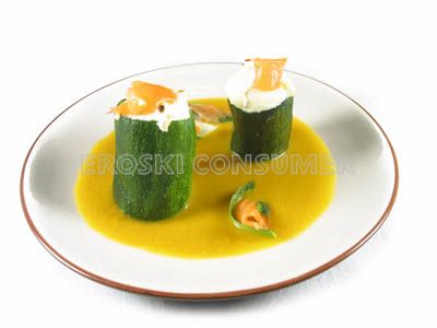 Las hortalizas rellenas suponen un buen modo de ofrecer estos nutritivos alimentos a los más pequeños, normalmente reacios a consumirlos. En esta receta el relleno está elaborado a base de salmón ahumado, que aporta al plato unas características organolépticas muy concretas y agradables. Si bien, es importante tener en cuenta que este tipo de pescados ahumados contienen una importante cantidad de sal, por lo que su consumo ha de ser moderado o restringido en personas con hipertensión arterial o problemas de retención de líquidos. Para que el relleno de los calabacines resulte jugoso y consistente se añade una salsa bechamel, cuyos ingredientes además de aportar proteínas y diferentes minerales, hacen que el contenido calórico del plato aumente.