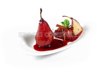 Las peras al vino suponen un modo diferente de consumir esta refrescante fruta. Son ricas en fibra, vitaminas entre las que destacan al ácido fólico y la B2, y minerales como el potasio. Por su composición, la pera es una fruta diurética, por lo que estaría indicada en casos de hipertensión arterial o retención de líquidos. Además es rica en taninos, lo que le aporta un suave efecto astringente, beneficioso en casos de diarrea. Para que el postre resulte lo más sabroso posible, conviene utilizar un vino tinto de calidad. El vino es un líquido muy complejo. Contiene agua, alcohol, azúcares no fermentables, ácidos orgánicos y sales minerales además de sustancias colorantes y taninos con potente capacidad antioxidante. Los beneficios del consumo moderado de vino, derivan de una serie de sustancias no nutritivas que ejercen numerosas funciones en el organismo. Aunque en principio los ingredientes principales utilizados en esta receta son saludables (en el caso del vino siempre que no se abuse de su consumo), no hay que olvidar que la receta requiere una cantidad importante de azúcar, si bien este puede sustituirse por un edulcorante no calórico. De todos modos, la pera se rellena con crema de nata y se decoran con caramelo, por lo que el contenido calórico del plato va a verse incrementado.