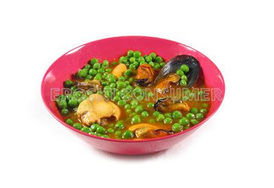 Los guisantes son un alimento que destaca por su riqueza energética, debido a su contenido en hidratos de carbono (almidón en su mayor parte) y en proteínas vegetales. Son una fuente importe de fibra, más abundante en su piel, y es la que le confiere la textura rígida y dura. Sobre el resto de legumbres destaca su contenido en vitamina B1. Contienen cantidades interesantes de otros nutrientes, aunque en menor medida si se compara con otras legumbres. Los guisantes se acompañan de mejillones, convirtiendo a este plato en un modo diferente de consumir guisantes, ya que normalmente se acompañan de jamón y patata. Los mejillones son muy nutritivos y su sabor es excelente, a pesar de que se les considera de menor calidad gastronómica que otros moluscos bivalvos tales como las ostras o las almejas. En general, destaca sobretodo su aporte de proteínas y hierro. Al cocinar este plato con mantequilla, el contenido calórico y graso del mismo aumenta. La mantequilla es un producto que tiene un alto contenido de grasas, grasas saturadas, colesterol y calorías. Dado que la mayor parte de la mantequilla es grasa láctea, es importante también su contenido en vitaminas liposolubles, principalmente vitaminas A y D. Si se prefiere, la mantequilla podría sustituirse por aceite de oliva, aportando al plato buena cantidad de sustancias muy beneficiosas para la salud.