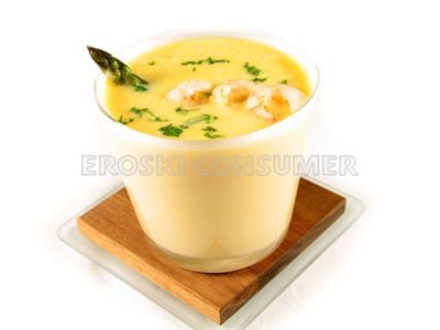 Servimos acompañando la sopa con las gambas peladas y ligeramente sofritas en una sartén con una cucharada de aceite de oliva y sal.