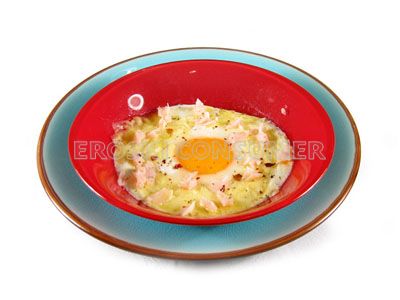 La base de este plato son los huevos, alimentos cuya proteína es considerada la de más alto valor biológico. En este caso los huevos se cocinan al baño maría en el horno en vez de fritos, una de las formas más habituales de hacerlos, por lo que su contenido graso no se ve aumentado. Sin embargo, ha de tenerse en cuenta que los huevos se acompañan de queso fundido, que se caracteriza además de por ser buena fuente de calcio, fósforo y proteínas, por ser rico en calorías, sal y colesterol. Por lo tanto, debido a todas las características que este plato posee, personas con problemas de exceso de peso o aquellas que presenten niveles altos de colesterol o trigicéridos en sangre, deberán moderar el consumo de platos de este tipo.