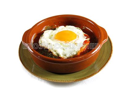 Colocamos los huevos fritos en las cazuelas de barro, encima de las tortas, y vertemos la salsa de tomate caliente.