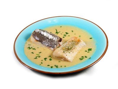 Pasamos por la batidora hasta conseguir una crema ligera. Volvemos a poner al fuego y espolvoreamos con perejil picado. Comprobamos el punto de sal de la salsa y salseamos con ella los lomos de merluza que hemos reservado en la cazuela de barro.