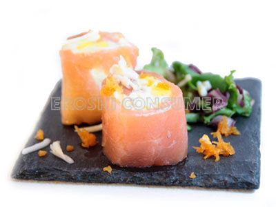 Extendemos el relleno sobre las lonchas del salmón con ayuda de la manga pastelera y enrollamos haciendo canutillos.