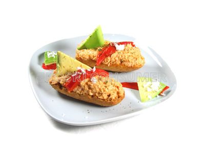Los aperitivos tan deliciosos como este son muy apropiados para tomar en una reunión o como entrante en una comida festiva, aunque conviene no excederse en su consumo para evitar una ingesta elevada de calorías, ya que contiene alimentos de alto valor calórico. Los que más contribuyen a incrementar las calorías de la receta son la nata, la margarina y los aguacates, fuente todos ellos de grasa aunque no todos tienen los mismos efectos para la salud. La nata aporta grasa saturada de origen animal que aumenta el colesterol de la sangre y por lo tanto no se recomienda en caso de hipercolesterolemia o si existe un riesgo elevado de padecer un accidente cardiovascular. Los aguacates en cambio son ricos en grasa monoinsaturada del tipo que se encuentra en el aceite de oliva y que es cardiosaludable. Esta fruta es una de las más calóricas y destaca así mismo por su contenido en vitamina E, de acción antioxidante. El atún proporciona proteínas y al ser un pescado azul es fuente de grasa omega 3, que también ayuda a proteger la salud del corazón. La páprika y la pimienta son condimentos fuertes que pueden causar molestias si se tiene el estómago delicado, por lo que conviene evitar su empleo.