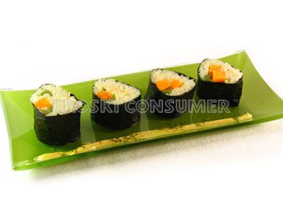 Las algas, el ingrediente más llamativo de esta receta, forman parte de manera habitual de numerosas preparaciones típicas de la cocina vegetariana, y en algunos países del centro de Europa, Japón, Chile, Islandia y sur de Gales, las algas son alimentos integrantes de la alimentación cotidiana. Hoy en día, adquirir algas no supone un gran problema, por lo menos el producto en estado seco, ya que actualmente se comercializan en la mayoría de las tiendas de herbodietética y herboristerías. Las algas Nori en concreto, son un tipo de algas pardas que destacan por su contenido en proteínas, fósforo y provitamina A, y combinan especialmente bien con alimentos fritos. Además de enriquecer el plato de arroz, en dichos nutrientes, proporcionan un cierto sabor a sardina. En este plato el arroz no es el ingrediente principal, por lo que el contenido total de hidratos de carbono es moderado. El arroz es un alimento contraindicado en caso de estreñimiento, aunque al ser integral contiene fibra, al igual que las algas. Si además se completa el menú con un entrante de ensalada y fruta fresca de postre, el aporte de fibra está más que garantizado. Este plato no es muy recomendable para quienes por motivos de salud deben restringir la cantidad de sal de su dieta, ya que las algas son alimentos ricos en sodio por naturaleza.