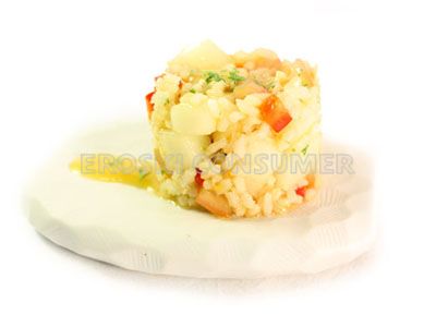 Conseguir platos apetecibles y sabrosos, originales o llamativos, mediante la combinación de alimentos de diversos grupos es cuestión de técnica y sapiencia culinaria, que nos permiten transformar una receta mediocre en un plato especial. Es el caso de esta receta en la que se cocina el arroz, un alimento con un sabor neutro, con diversas hortalizas y frutas de sabores tan distintos, proporcionan un contraste y un aroma particular al plato. Además, la mezcla de alimentos le dan color al plato y en parte, lo hacen más apetecible, porque no hay que olvidar que muchas veces el apetito entra por la vista. De manera que este plato, dada la sencillez de sus componentes, puede ser degustado por cualquier persona, sana o enferma, incluso por quienes sufren de estreñimiento, ya que los vegetales suplen la carencia de fibra del arroz. Teniendo en cuenta que el arroz, al igual que el resto de cereales, es un alimento energético dado su contenido en hidratos de carbono (almidón), quienes siguen una dieta de adelgazamiento, lo pueden incluir perfectamente en su alimentación, siempre y cuando sean comedidos con la ración de consumo.