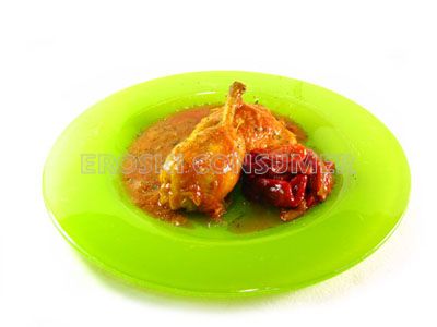 Civet de pollo guisado con pimientos en tiras