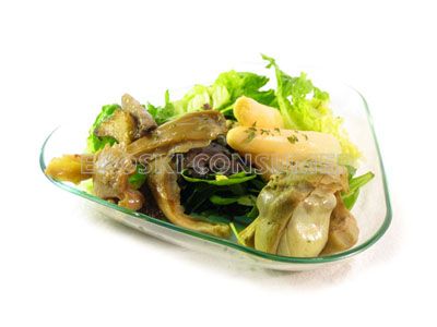 Por encima de las lechugas aliñadas colocamos las setas junto con las alcachofas y los espárragos.