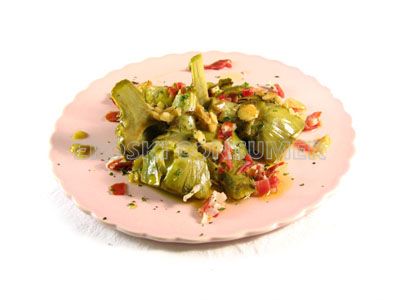 Escurrimos las alcachofas, las introducimos en la cazuela y las rehogamos, cuidando de que no se doren los ajos. Salpimentamos.