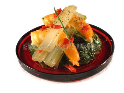 Presentamos como base unos montoncitos de hoja de acelga y encima las pencas con langostinos, y salseamos con la vinagreta de soja.