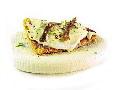 Untamos la crema resultante sobre las rebanadas de pan ligeramente tostado y colocamos encima las anchoas desaladas.