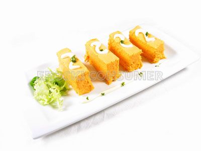 Vertemos la mezcla en un molde rectangular, como los de hacer Plum Cake, untado de mantequilla y espolvoreado con pan rallado y metemos a un horno previamente calentado a 200 °C hasta que se haga, aproximadamente unos 45 minutos.
