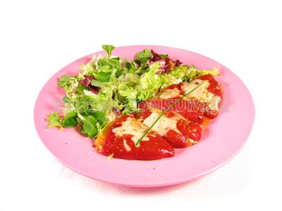 Disponemos sobre un plato las lechugas, aliñamos y encima colocamos los pimientos calientes.
