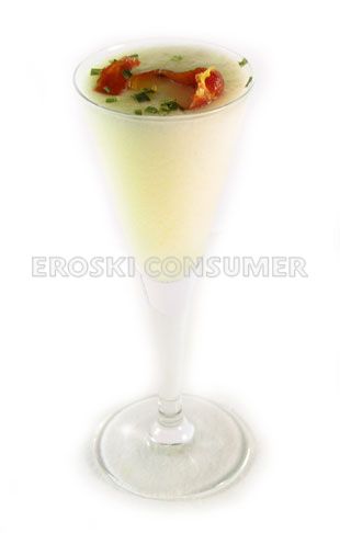 Servimos en copa fría y acompañado de unos trocitos de paletilla ibérica o con un crujiente de jamón. Para elaborar el crujiente de jamón, colocamos los taquitos de jamón serrano en un plato tapado con una tapa apta para microondas durante 5 minutos a potencia media.