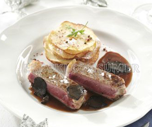 - Láminas de entrecot con reducción de trufa y chips de manzana
