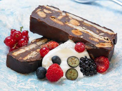 Se remojan las galletas con vino moscatel y se coloca una base como primera capa en el molde; otra capa de la crema de turrón de chocolate, otra de galleta y otra de crema. Se cierra el film sobre la última capa y se mete al frigorífico o congelador hasta que se endurezca lo suficiente para cortar en rodajas que se acompañarán de una crema chantilly. Esta crema se elabora batiendo la nata con el azúcar glass y la esencia de vainilla, hasta espesar. Por último se sirve todo el conjunto decorado con frutos rojos.
