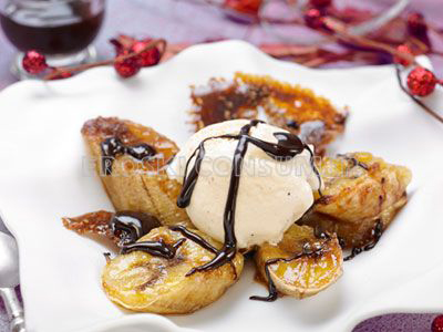 Postre a base de plátano, un alimento con una gran cantidad de magnesio y potasio. Se acompaña con chocolate, y la mezcla de sabores es exquisita. El chocolate aporta antioxidantes y minerales tales como el cobre, zinc y el calcio. El contenido en hidratos de carbono es muy elevado, por lo que se puede evitar tomar el helado, teniendo entonces un contenido solamente algo superior al de la pieza de fruta habitual. El azúcar de la receta es totalmente necesario para hacer la caramelización, no pudiéndose sustituir por edulcorantes. No obstante, la cantidad es pequeña, por lo que no debe producir grandes alteraciones en los niveles de glucosa en sangre.