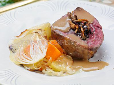 Por último, se asan unas patatas, zanahorias y cebolletas frescas en el horno, cortadas en finas tiras con ayuda de una mandolina y untadas de aceite del salteado y una pizca de sal. Se sirven los solomillos quitándoles la brida pero manteniendo la loncha de tocino o de bacón, se salseas con el desglase y se acompaña de las verduritas asadas.