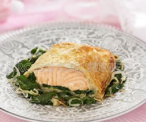 El salmón es uno de los pescados grasos más consumidos. Este tipo de pescado contiene algo más de grasa que los pescados blancos, pero se trata de grasas muy saludables que contribuyen a disminuir el riesgo de que aparezcan enfermedades cardiovasculares. Es una receta en la que los hidratos de carbono están aportados por el hojaldre.