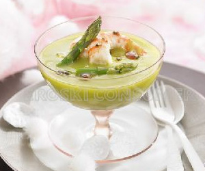 Esta puede ser una de las preparaciones que ayuden a que una de las comidas o cenas de celebración sea más baja en calorías e hidratos de carbono. Esta velouté a base de espárragos y langostino consigue incluir muy poca grasa con lo que las calorías por plato no llegan a las 200. Además, los espárragos son un alimento muy rico en agua, por lo que su contenido en hidratos de carbono es especialmente bajo.