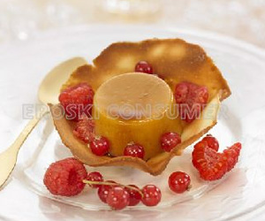Mezclar la leche con el azúcar y la piel del limón. Mientras tanto, batir la nata con el sobre de cuajada y el turrón blando. Añadir esta mezcla a la primera y calentar. Dejar que el conjunto espese pero sin que llegue a hervir. Verter el contenido en moldes tipo flanera (previamente caramelizados), tapar y dejar reposar a temperatura ambiente durante 4 horas. Para elaborar las pastas tulipas, en primer lugar mezclar la mantequilla pomada y el azúcar. Añadir la harina, la almendra en polvo y mezclar todo bien. Batir las claras en un recipiente amplio hasta que quede parecido al merengue y añadir con cuidado a la mezcla anterior. Extender una porción de la pasta con el dorso de una cuchara sobre la placa del horno engrasada. Con un movimiento circular se extiende para que la capa quede lo más fina posible. Después, se hornea a 160° C durante unos 4 minutos, hasta que estén hechas y se sacan del horno. Con una espátula se despegan de la placa en caliente y se colocan encima de un vasito para que cojan la forma al enfriarse. El proceso debe hacerse de manera rápida y organizada: no hay que desprender la masa de la placa hasta que los vasitos estén dispuestos ya que se enfrían muy rápido y es importante que adquieran la forma de tulipa. Cuando estén frías las tulipas y justo en el momento de servir, se desmolda el cremoso de turrón sobre la tulipa y se colocan las frutas rojas.