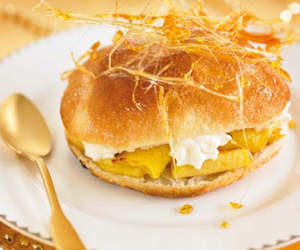 Láminas de hojaldre, piña, caramelo hilado y nata