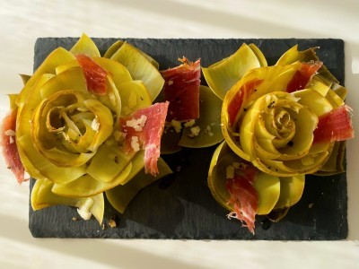 Flores de alcachofa con jamón serrano, parmesano y truja
