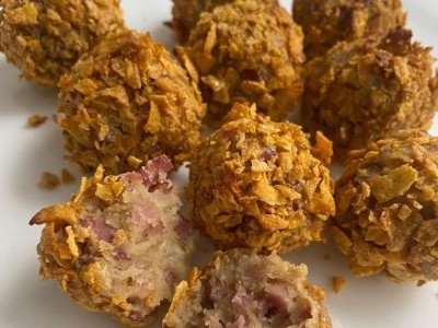 5. Haz bolitas con la masa y primero pásalas por huevo y después por los copos de