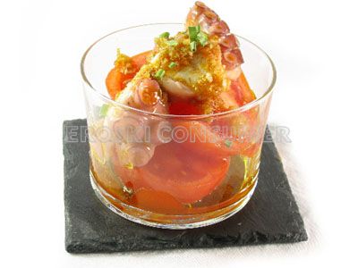 En un bol presentamos una base de tomates troceados y encima colocamos el pulpo. Aliñamos con la vinagreta de pimentón con cebolleta.