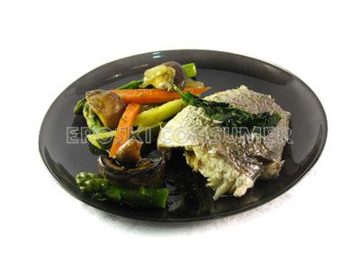 Retiramos del papel de aluminio los lomos de dorada con sus verduras, los emplatamos y ya se pueden servir.