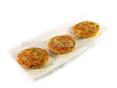 Las colocamos sobre una base metálica untada de aceite para que no se pegue y la horneamos durante 10 minutos a 200º C. Una vez cocinadas ligeramente, sacamos las masas de pizza del horno y colocamos una base de tomate frito sobre ella.