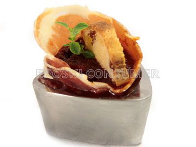 Sobre una tosta de pan con pasas hacemos un cono con una loncha de jamón y rellenamos con un cucharadita de la confitura de piquillo a temperatura ambiente.