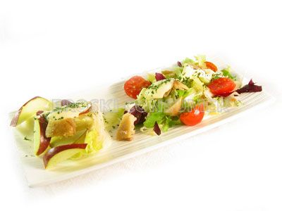Podemos utilizar pollo asado que nos haya sobrado del día anterior. Lo troceamos y mezclamos con la manzana, las hojas de lechugas variadas y los tomates cherry.