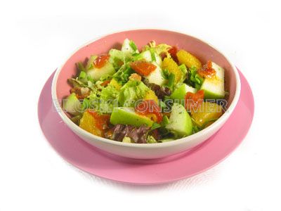 Este es un ejemplo de cómo una ensalada liviana se puede convertir en un plato contundente. Los ingredientes más ligeros, como las hortalizas (berros, rúcula, cebolleta, pimientos) y las frutas (manzana y naranja), se combinan con otros energéticos como las nueces, la mayonesa y el queso. Estos últimos son los que aportan mayor cantidad de calorías al plato. Las hortalizas verdes aportan buena cantidad de fibra y ácido fólico, una vitamina que interviene en el desarrollo y la maduración de los glóbulos rojos, por lo que la deficiencia de esta vitamina puede dar lugar a la aparición de anemia. El ácido fólico es necesario especialmente en la gestación, y su carencia en la dieta de las embarazadas está ligada al retraso en el crecimiento del feto y defectos del tubo neural como la espina bífida. Las nueces brindan variedad de minerales, vitamina E y ácidos grasos insaturados cardiosaludables.