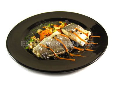 Lomos de lubina asada con verduritas, trufa y salsa de piquillo