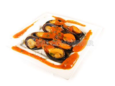 Salseamos los mejillones con la salsa de tomate ligeramente picante. Servimos en frío o ligeramente calentados en el microondas.