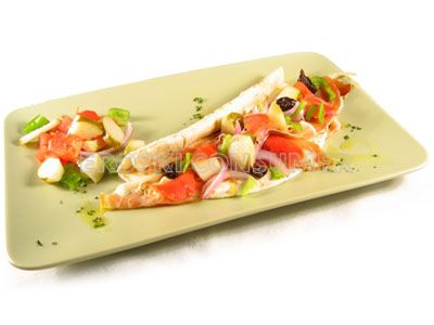 Rellenamos las crepes con un tomate troceado, cebolleta fresca, pimiento verde, unos trocitos de pera y ciruelas pasas.