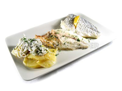 Dorada al horno con sucedáneo de angulas y limón