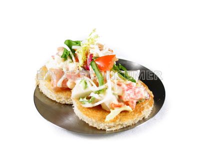 Sobre cada rueda de pan, colocamos la mezcla de chatka. Se sirve casi al momento, para que el pan no se reblandezca.