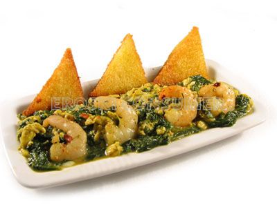 Cuando estén dorados, añadimos las espinacas descongeladas y escurridas junto con las colas de gambas.