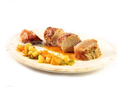 Cortamos en tacos los solomillos y salseamos con la salsa. Acompañamos con un pisto de hortalizas de la temporada.