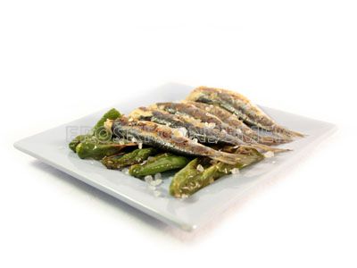 Servimos las sardinas sobre la cama de pimientos verdes fritos.