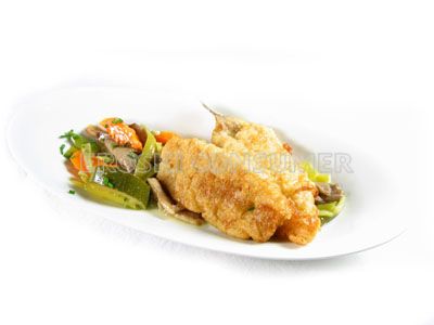 Servimos sobre una cama de verduras salteadas como tiras de puerro, zanahoria, bastoncitos de calabacín, setas troceadas en láminas; todo ello salteado a la vez en una sartén con unas cucharadas de aceite de oliva y una pizca de sal.